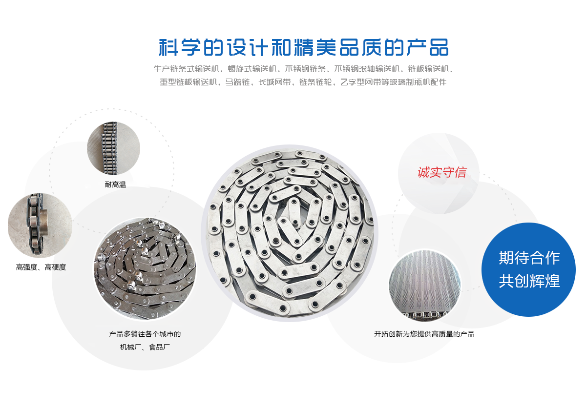 生產(chǎn)鏈條式輸送機(jī)、螺旋式輸送機(jī)、不銹鋼鏈條、不銹鋼滾軸輸送機(jī)、鏈板輸送機(jī)、重型鏈板輸送機(jī)、馬蹄鏈、長(zhǎng)城網(wǎng)帶、鏈條鏈輪、乙字型網(wǎng)帶等玻璃制瓶機(jī)配件,食品機(jī)械配件及各種網(wǎng)帶的專業(yè)廠家 ,多年來(lái)產(chǎn)品暢銷各地玻璃廠和食品廠,在玻璃制品等行業(yè)中享有較高的聲譽(yù)。公司集摸具開發(fā)、機(jī)械設(shè)計(jì)生產(chǎn),銷售于一體的生產(chǎn)型企業(yè)。生產(chǎn)的自動(dòng)化流水線金屬傳動(dòng)網(wǎng)帶、鏈條等產(chǎn)品廣泛用于玻璃機(jī)械、食品機(jī)械、化纖機(jī)械、醫(yī)藥、電子、烘干機(jī)械、輪胎機(jī)械等行業(yè)。產(chǎn)品多銷往各個(gè)城市的機(jī)械廠、食品廠和一些涉及流水線或自動(dòng)化設(shè)備的公司。